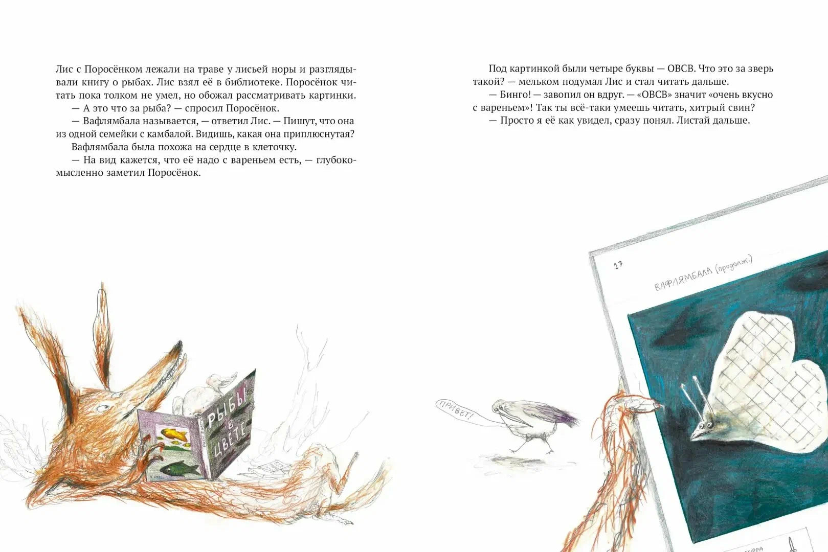 Очередное приключение Лиса и Поросёнка началось с книги о рыбах, которую они рассматривали. Каких только рыб там не было! Горлодёр и двуголавль, ржавчник и карпофель, шилозад и дымойва... Но всех их затмила прекрасная вафлямбала. Похожая на сердце в клеточку, аппетитная, как вафля, хоть с вареньем ешь, — как тут устоять!