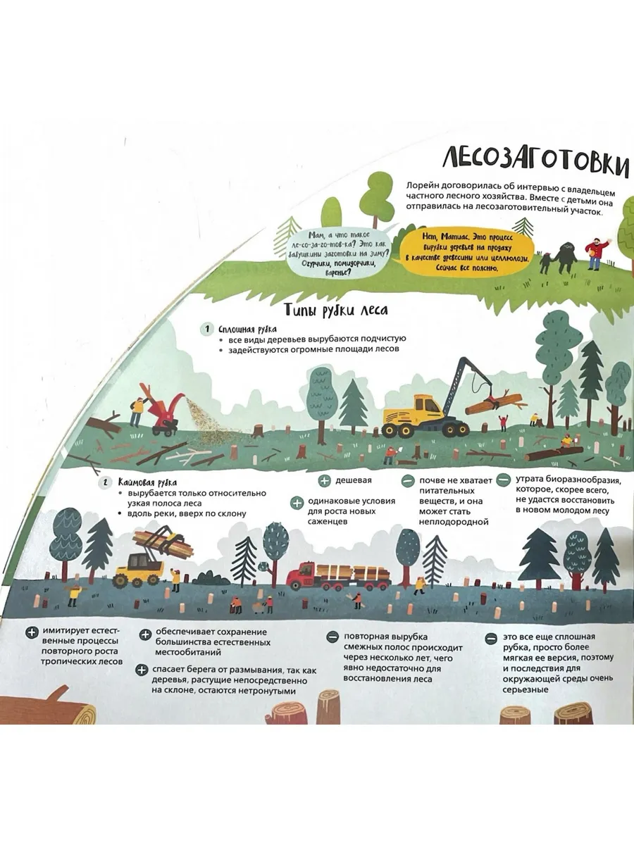 Вместе с Лорейн, преподавателем биологии, мы отправимся в путешествие к уникальным лесам! Чем грозит их вырубка, какие бывают лесные профессии, как выращивать собственные леса — об этом и не только — в головокружительной книге с секретными круглыми разворотами.