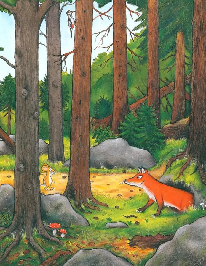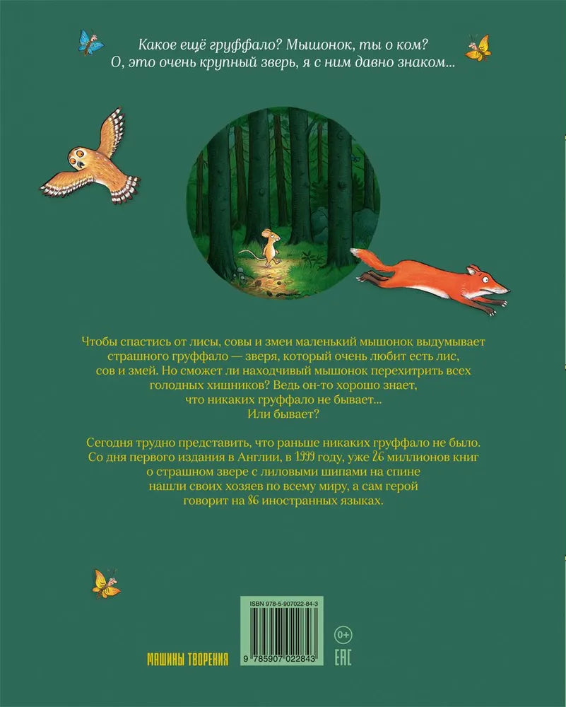 Сказка в стихах для чтения взрослыми детям. Маленький мышонок идет через дремучий лес и, чтобы спастись от лисы, совы и змеи, выдумывает страшного Груффало - зверя, который очень любит есть лис, сов и змей. Но сможет ли находчивый мышонок перехитрить всех голодных хищников? Ведь он-то хорошо знает, что никаких Груффало не бывает. Или бывает?