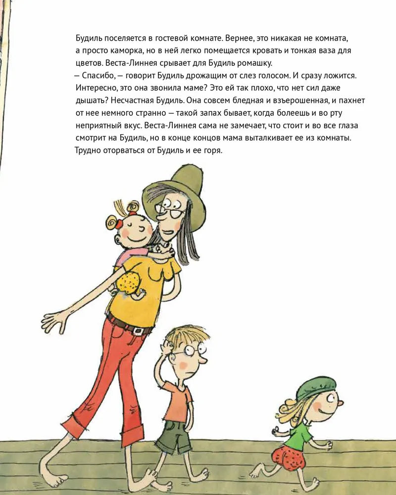 Весте-Линее иногда бывает грустно. Просто так, ни с того, ни с сего. Но грусть бывает очень разная. Вот приезжает мамина подруга Будиль, которая потеряла любимого человека, — она лежит на кровати в маленькой комнатке и плачет, плачет, плачет. Но тоска проходит, даже самая черная-пречерная. Веста-Линнея сидит на кухне в лунном свете и думает о том, что без грусти нет и радости, а жизнь — это жизнь.