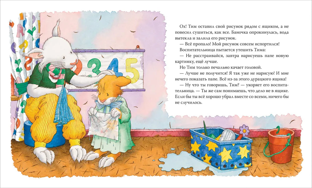 У мышонка Тима много игрушек. Поэтому, когда приходят друзья, никто не скучает. Вот только потом кто-то должен расставить все по своим местам… А Тим совсем не любит убираться. Зато любит рисовать акварелью! Мышонок как раз закончил чудесный рисунок для папы, только на него так невовремя опрокинулась баночка с водой. Тим забыл ее убрать… ой-ой-ой что же делать?!