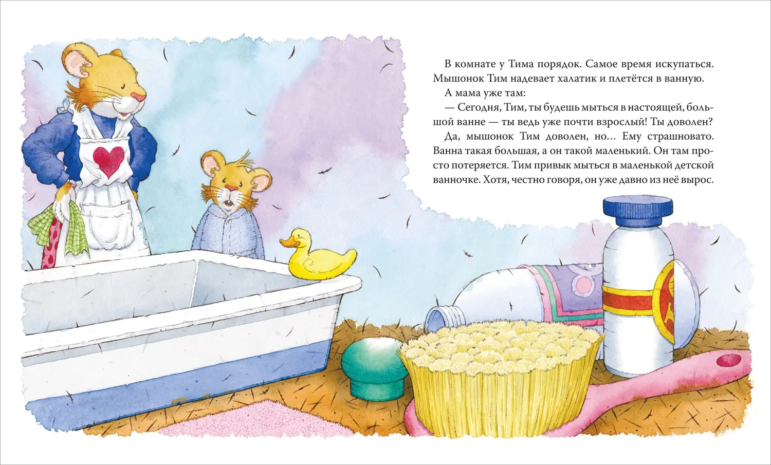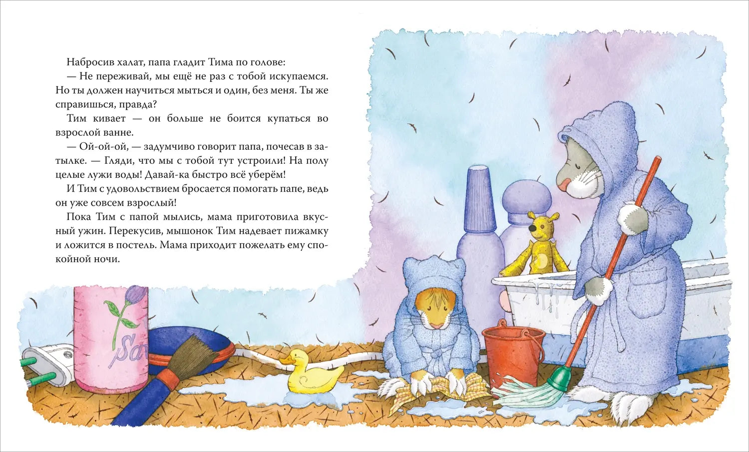 Мышонок Тим уже совсем взрослый: он заметно вырос и уже может сам убрать свои игрушки по местам. А вот купаться в большой взрослой ванне пока боится. Как же быть? На помощь Тиму приходит папа. Ведь купаться вместе – это очень-очень весело! И даже шампунь не так уж сильно щиплет глазки.