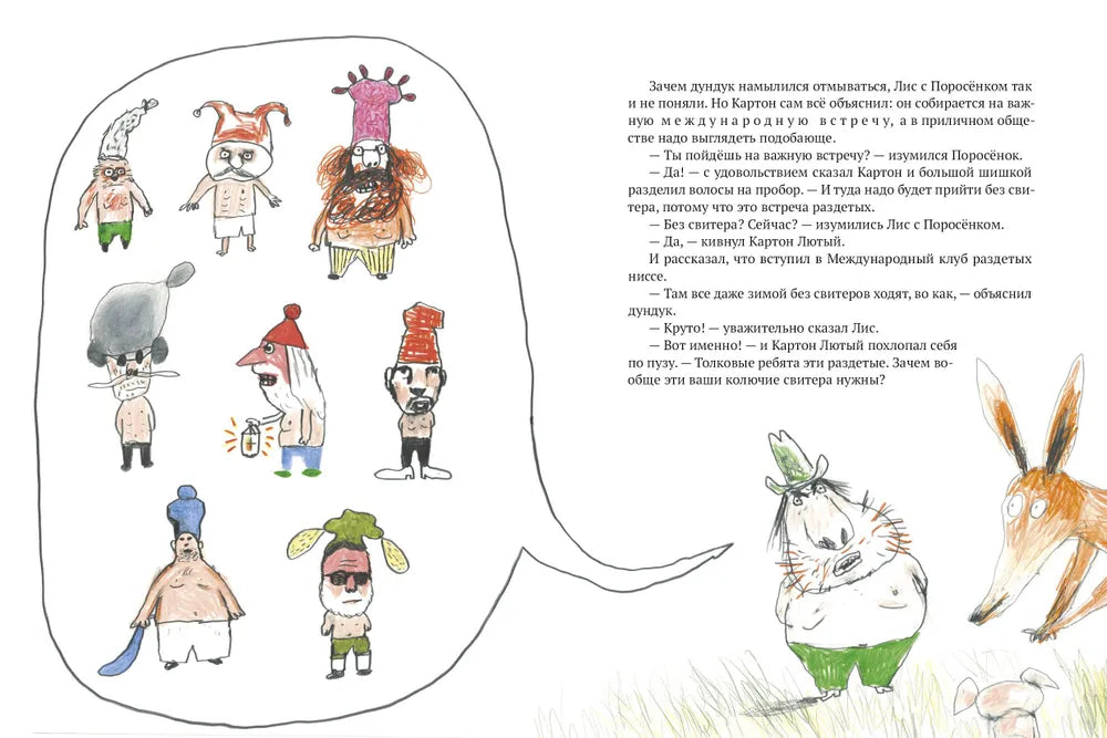 Картон Лютый заделался почётным членом клуба ниссе. И даже получил приглашение на новогоднюю встречу. Международную, между прочим. На таких важных мероприятиях дундук и не бывал никогда, идти самому боязно. Может, Лис с Поросёнком составят ему компанию? Друзья охотно соглашаются: там ведь будет лотерея с подарками и хоровод вокруг ёлки. Вот только приходить на праздник отчего-то нужно раздетым, без свитера…