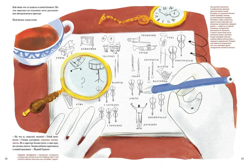 Книга начинается с пропажи самого важного участника оркестра Славы Музыкалкина — Треугольника. За дело берется детектив Гобой — ему нужно опросить всех музыкантов и обязательно найти Треугольника до начала концерта. А пока Гобой проводит расследование, автор Евгения Русинова расскажет вам все об оркестре и музыкальных инструментах. Вы узнаете, что такое пюпитр, посмотрите на гримерную комнату и выясните, чем же первая скрипка отличается от всех остальных. На каждого участника расследования главный герой составит досье, из которого можно будет узнать поподробнее о любимом музыкальном инструменте — даже его вес и размер!