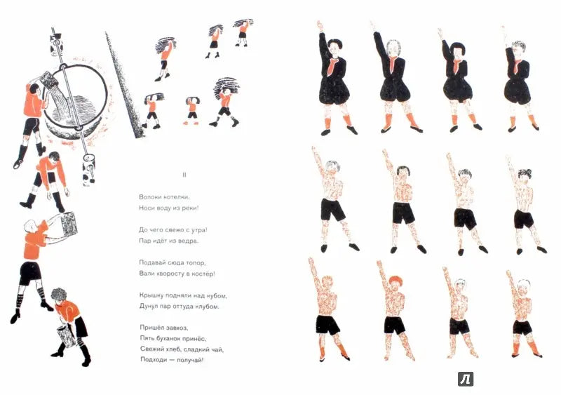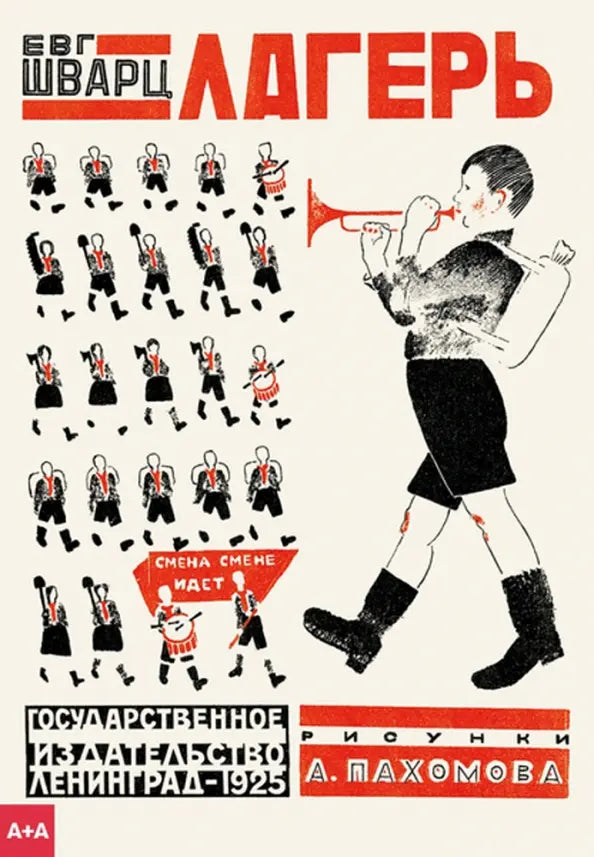 Книга Шварца и Пахомова была первой не только в биографиях писателя и художника, она также оказалась прорывом в книжном дизайне. Вся книжка "Лагерь" построена на двух цветах, и при этом ее полосы напоминают репродукции с живописи. Причина - литографская печать, оттиски делались с камней, они роскошно передают фактуру материала, живость зерна литографского камня. Красно-черные заливки хорошо гармонируют с проработкой а-ля сухая кисть. Секрет художника еще и в найденном способе передачи пространства: плоскостное решение композиций восходит к древнерусским иконописным клеймам, к "праздникам" со складней. Пахомов с детства видел и глубоко любил старую икону.
